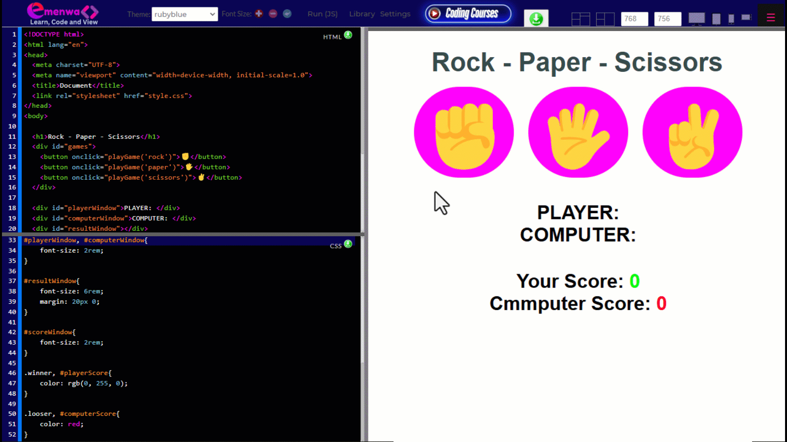 - Create a simple HTML layout with three buttons for Rock, Paper, and Scissors.